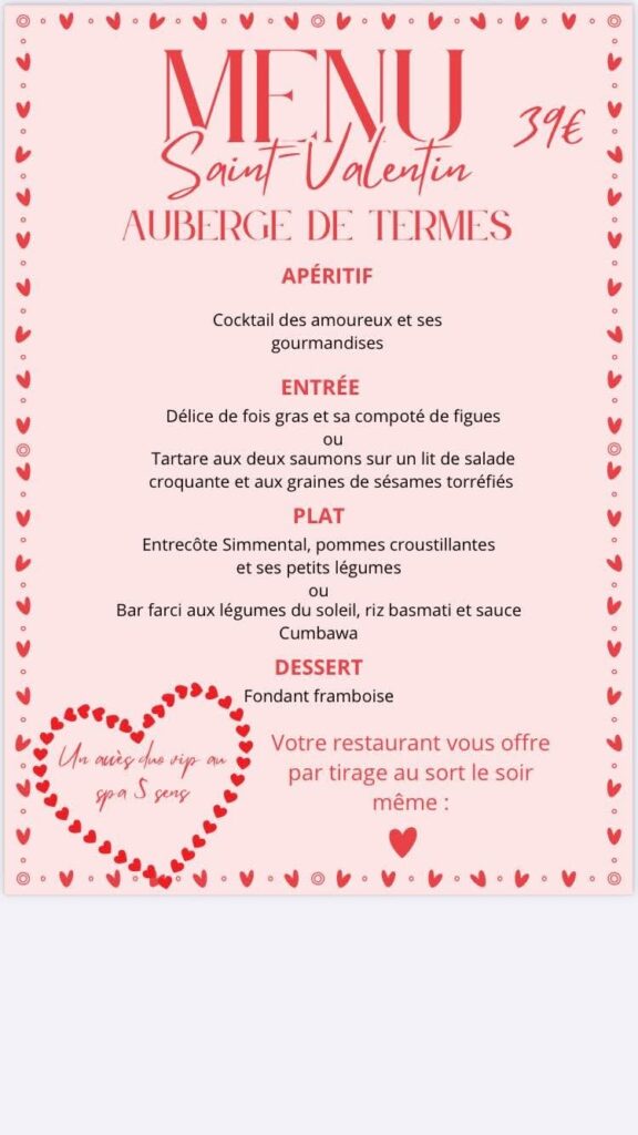 L’auberge de termes vous accueillera à partir du 14 février et pour sa première soirée un menu saint Valentin vous est proposé . Ensuite, elle ouvrira du lundi au dimanche de 9h30 à 23h avec une fermeture le mercredi .